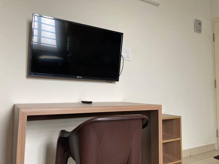 The Space: Open-plan layout with study desk, smart TV, kitchenette, and sleek bathroom.